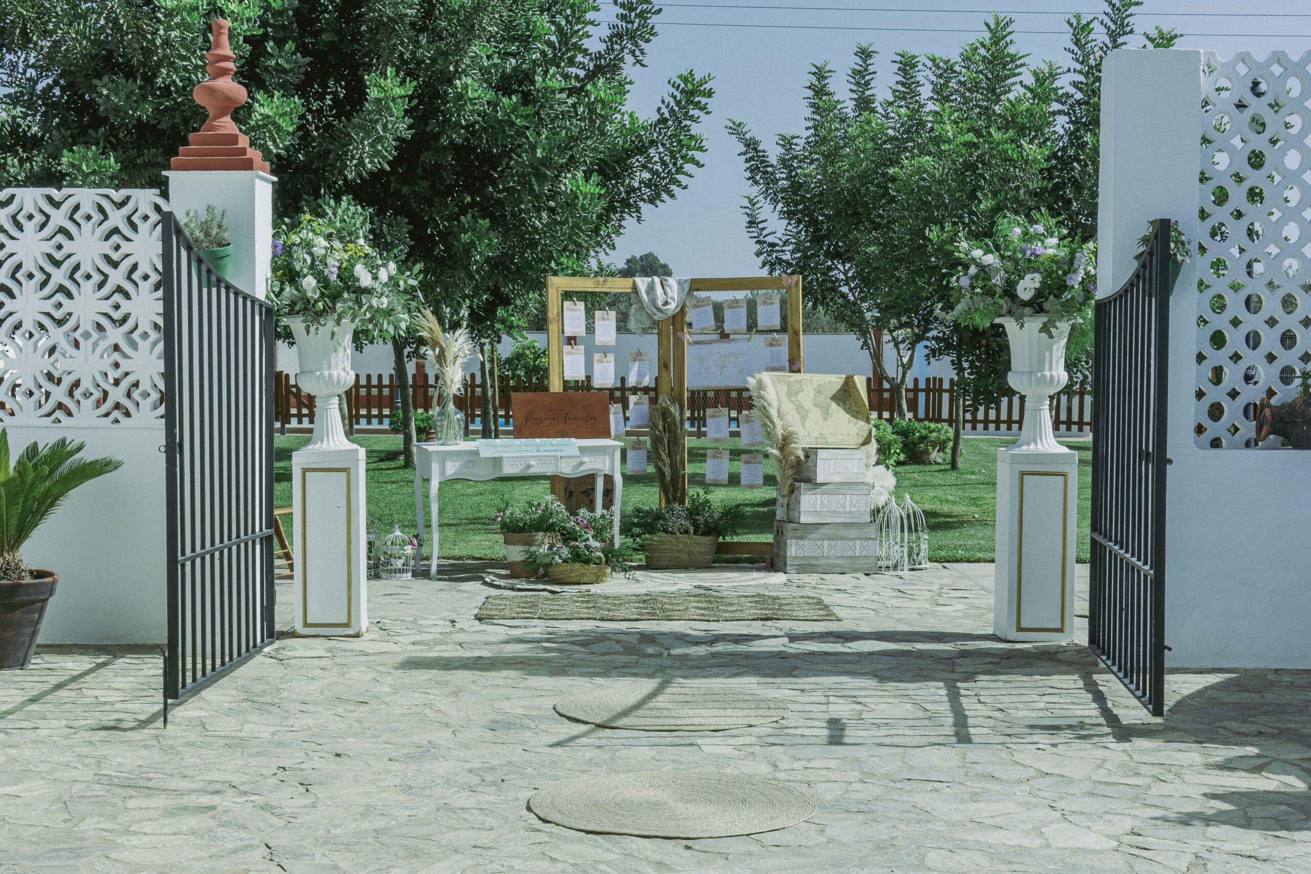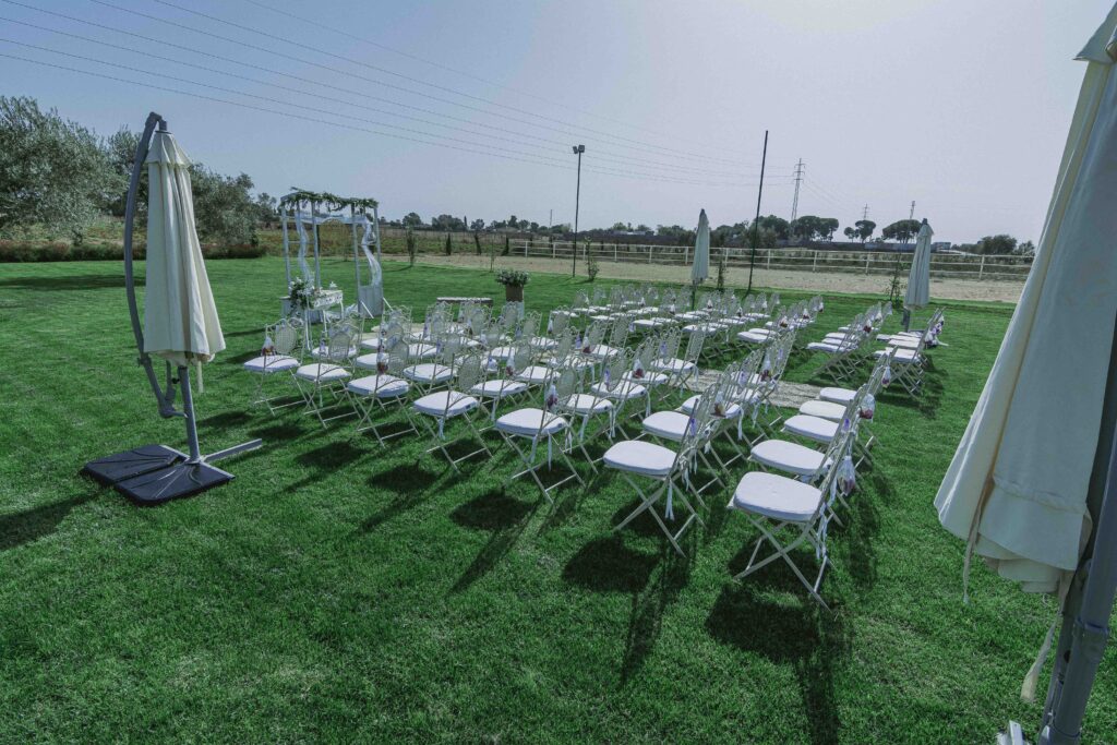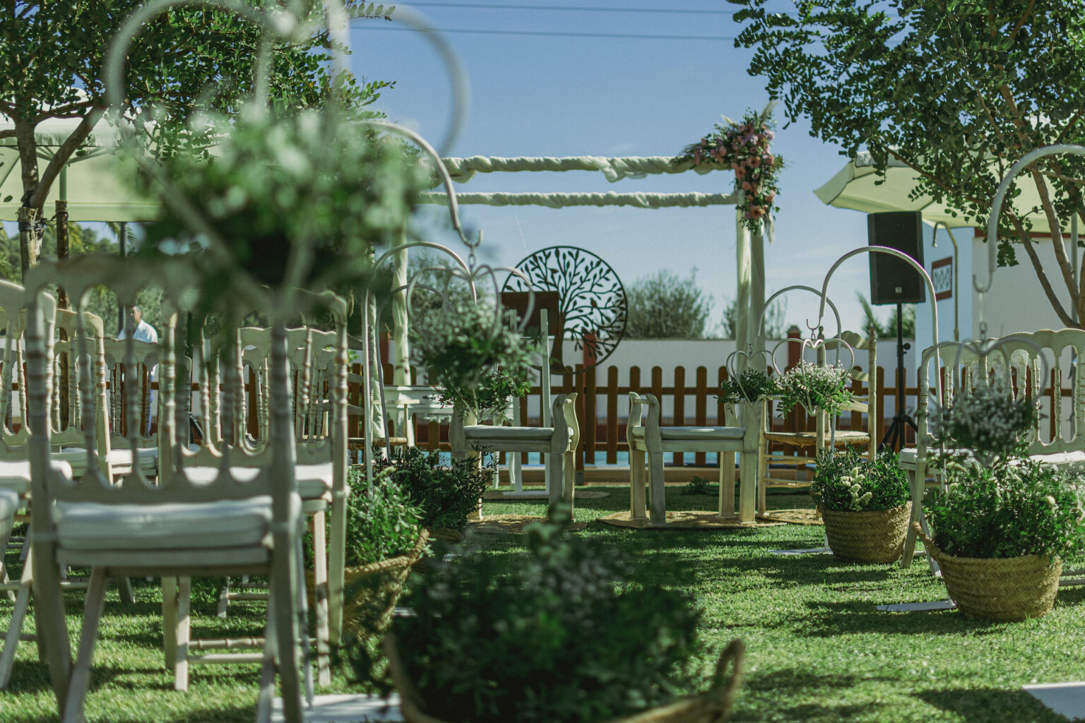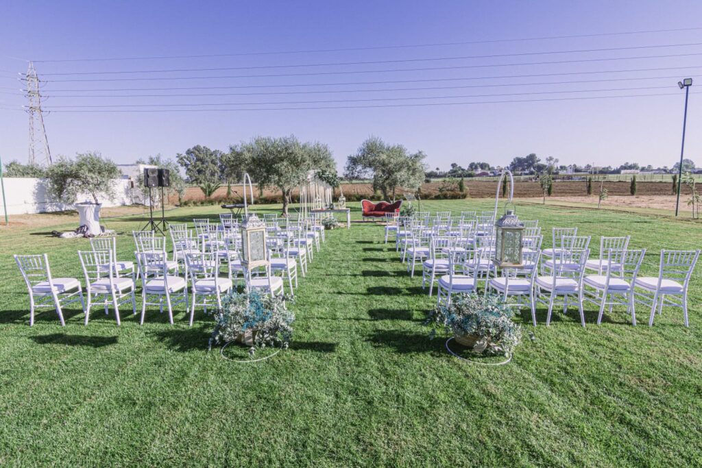 Zona de 1000m2 con el verde como protagonista y una bonita piscina de fondo que se configura como un enclave ideal para las celebraciones de ceremonias nupciales.